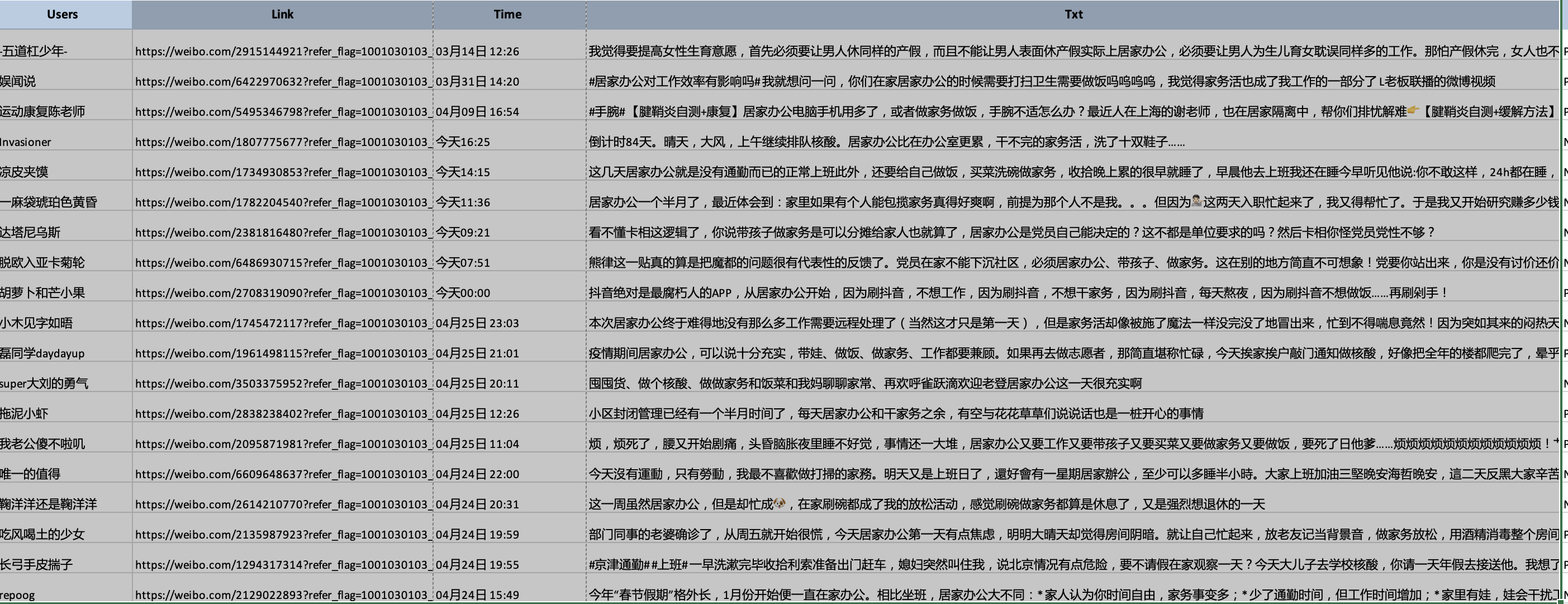 During the pandemic period, people force to stay at home and the social media have taken the centre stage of communication more than ever (Saud, Mashud and Ida, 2020). And in China, in particular, as the massive national-wide quarantine have been conducted since 2020 and still conduct in some area in 2022, soical media have undertaken the function of pandemic update, seeking social support, moreover, people also tend to self-disclosure their own experience on social medis during the pandemic period as other communication forms have beem affected by the self-isolation policy. Sina Weibo is one of the most used social media, with over 500 millions users by 2020, have played a unique role during the pandemic period (Wang et al., 2020). By analysing the media post on Weibo, we can have insight in people's opinion on work from home and whether work from home will cause gender ineuqality in workplace. We choose the keywords of "work from home", "housework", "gender" and "effciency" and filter the time period from 2020 to April 2022. And we collected overall 493 posts from Weibo.